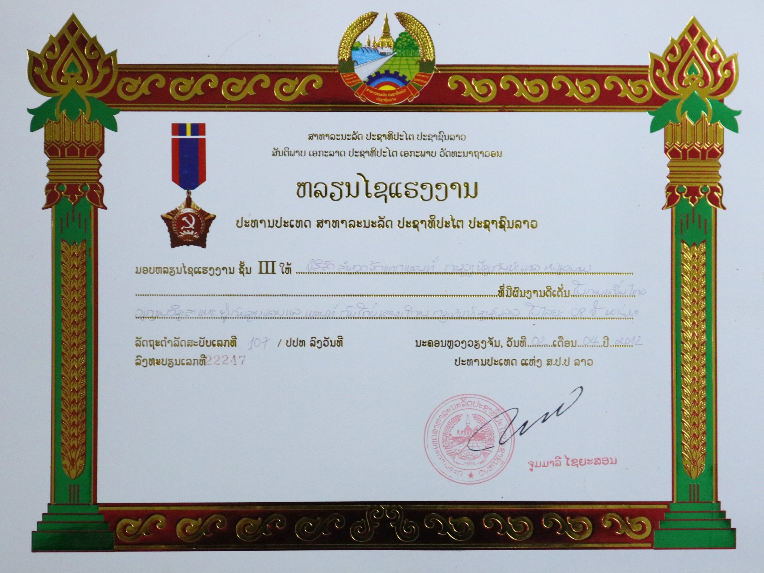 Huân chương lao động (hạng III) của Chủ tịch nước Cộng hòa Dân chủ Nhân dân Lào (Năm 2012)