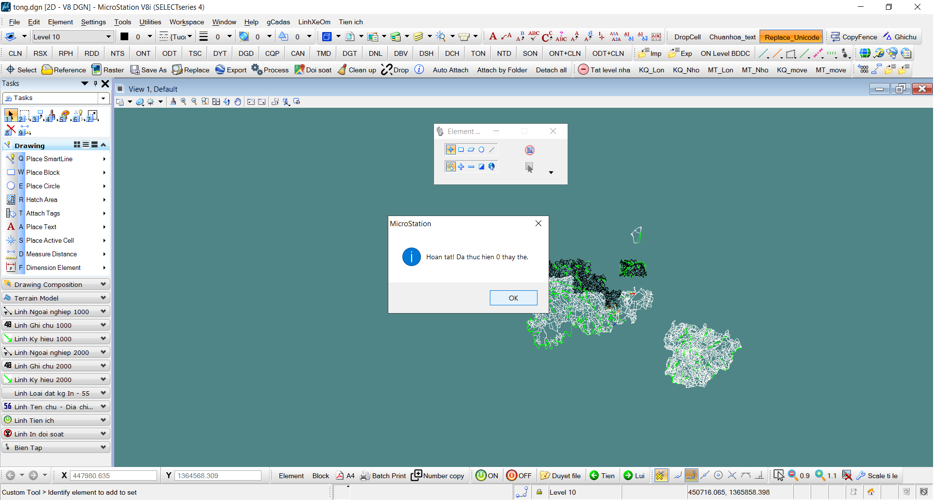 – Ngoài ra chức năng Process được dùng cho trường hợp muốn thay đổi 1 đối tượng xác định trên nhiều tờ bản đồ như: bật tắt level, in ấn, xuất kmz hoặc dxf, chuẩn hoá,…Đặc biệt có thể kết hợp các nút lệnh Tiện ích để thực hiện nhiều tờ một lúc.