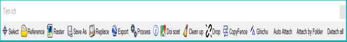 Một số công cụ quen thuộc được biết đến dùng để gọi nhanh các hộp thoại như: Select by Atributes, Reference, Raster, Find and Replace, Xuất KMZ nhanh, Xuất file lên máy RTK, Xoá trùng trùng đè, Drop, Xem thông tin đối tượng.
